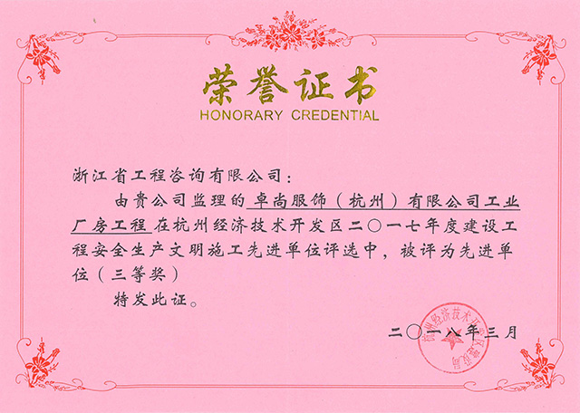 2017年度建設(shè)工程安全生產(chǎn)文明施工先進(jìn)單位-卓尚服飾(杭州)有限公司工業(yè)廠房工程