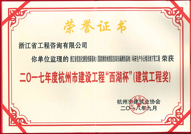 2017年度杭州市建設(shè)工程“西湖杯”(建筑工程獎)-浙江省信息化測繪創(chuàng)新基地(國家測繪地理信息局東海測繪基地)科研生產(chǎn)辦公樓及地下室工程