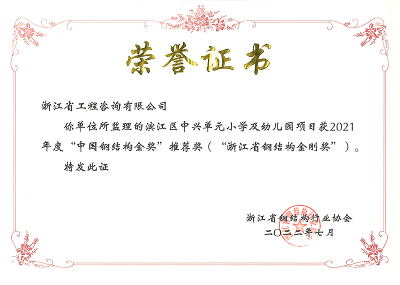 2021年度“中國鋼結(jié)構(gòu)金獎”推薦獎(浙江省鋼結(jié)構(gòu)金剛獎)-濱江區(qū)中興單元小學(xué)及幼兒園項(xiàng)目