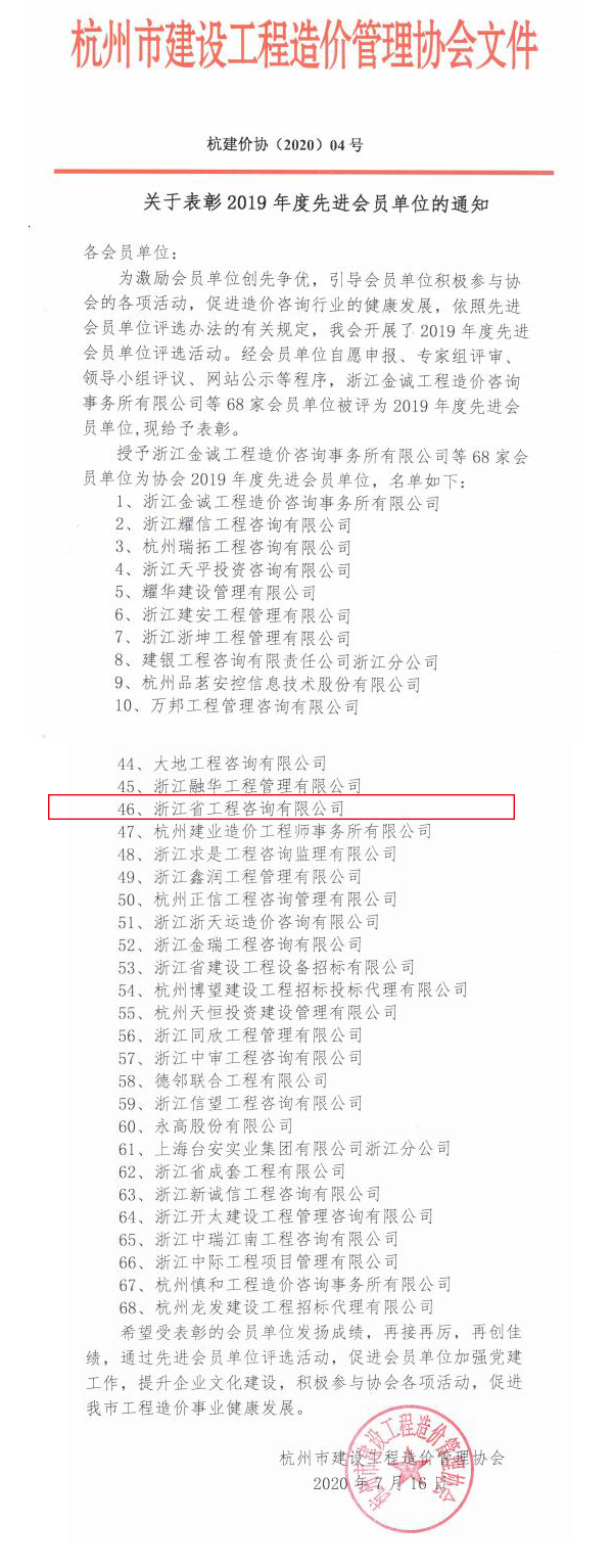 根據杭州市建設工程造價管理協會《關于開展2019年度先進會員單位評選活動的通知》和《先進會員單位評選辦法》的規定,經會員單位自愿申報、專家組評審、領導小組評議、網站公示等程序,我公司被評為杭州市建設工程造價管理協會2019年度先進會員單位。