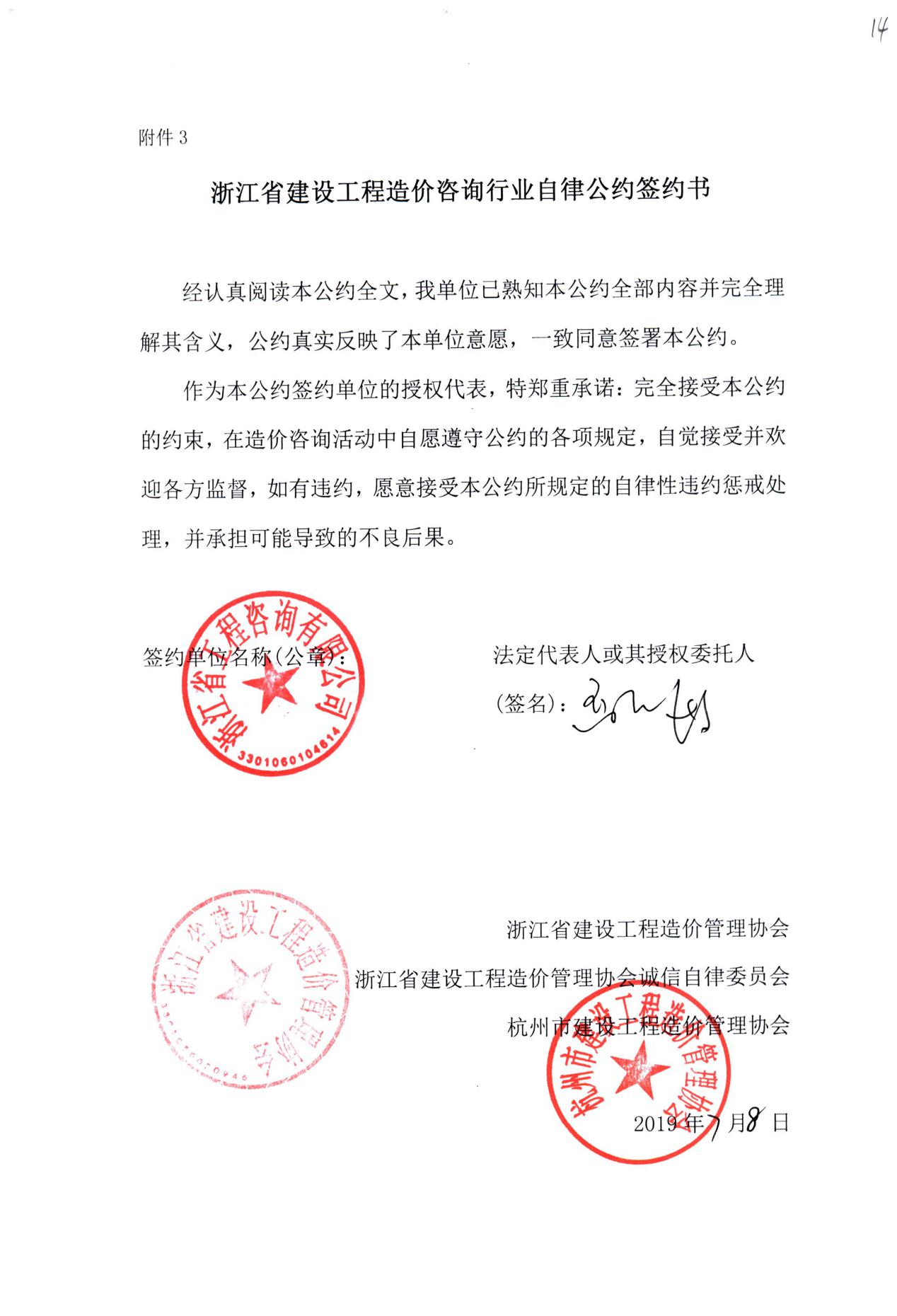 為貫徹落實(shí)國(guó)務(wù)院《關(guān)于促進(jìn)市場(chǎng)公平競(jìng)爭(zhēng)維護(hù)市場(chǎng)正常秩序的若干意見》和《社會(huì)信用體系建設(shè)規(guī)劃綱要(2014-2020年)》,浙江省建設(shè)工程造價(jià)管理協(xié)會(huì)誠(chéng)信自律委員會(huì)根據(jù)本省行業(yè)發(fā)展要求,結(jié)合實(shí)際發(fā)展情況,組織制定了《浙江省建設(shè)工程造價(jià)咨詢行業(yè)自律公約》及其實(shí)施細(xì)則。我公司積極響應(yīng)并簽署浙江省建設(shè)工程造價(jià)咨詢行業(yè)自律公約。