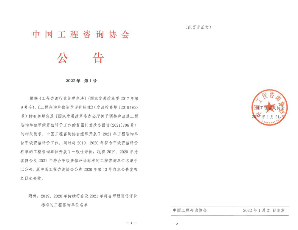 近日,根據(jù)《工程咨詢行業(yè)管理辦法》(國家發(fā)展改革委2017年第9號令)、《工程咨詢單位資信評價標準》(發(fā)改投資規(guī)[2018]623號)的有關規(guī)定及《國家發(fā)展改革委辦公廳關于調(diào)整和改進工程咨詢單位甲級資信評價工作的復函》(發(fā)改辦投資[2021]706號)的相關要求,中國工程咨詢協(xié)會組織開展了2021年工程咨詢單位甲級資信評價工作,同時對2019、2020年符合甲級資信評價標準的工程咨詢單位開展了一致性評價。我公司順利獲得建筑和市政公用工程專業(yè)工程咨詢單位甲級資信延續(xù)。