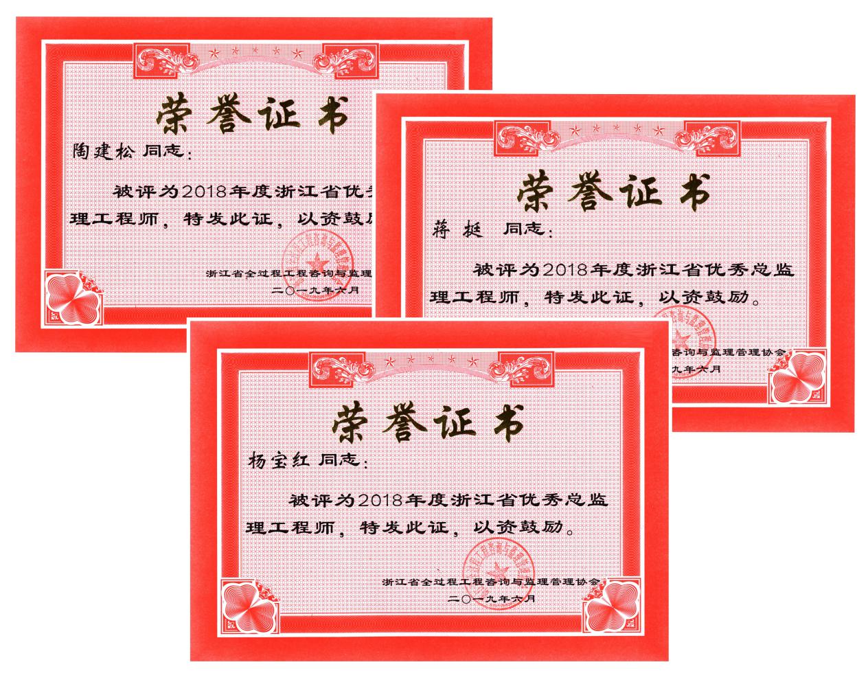我公司再次被評為浙江省優秀監理企業。第四事業部蔣挺、第六事業部楊寶紅和第九事業部陶建松三位同志被評為浙江省優秀總監理工程師。