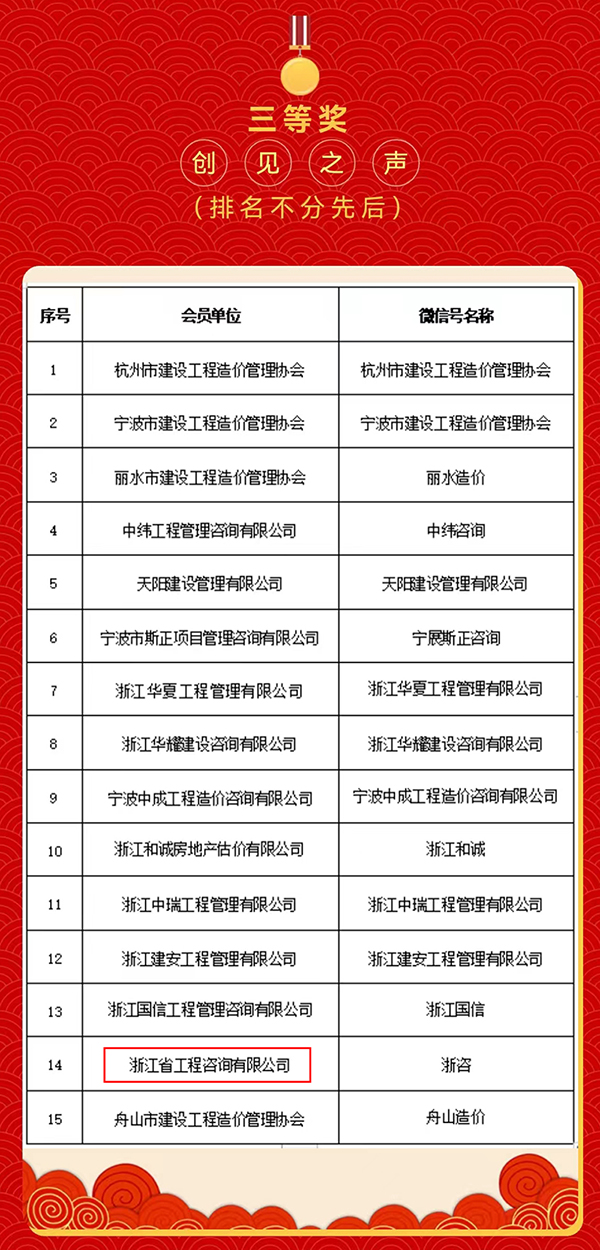 近日,浙江省建設工程造價管理協會舉辦了2022年度浙江省工程造價行業“浙江造價?新銳之聲”評選活動,我公司公眾號從報名的近200家單位,入圍的51個微信公眾號中脫穎而出,榮獲三等獎2022年度“浙江造價?創見之聲”。