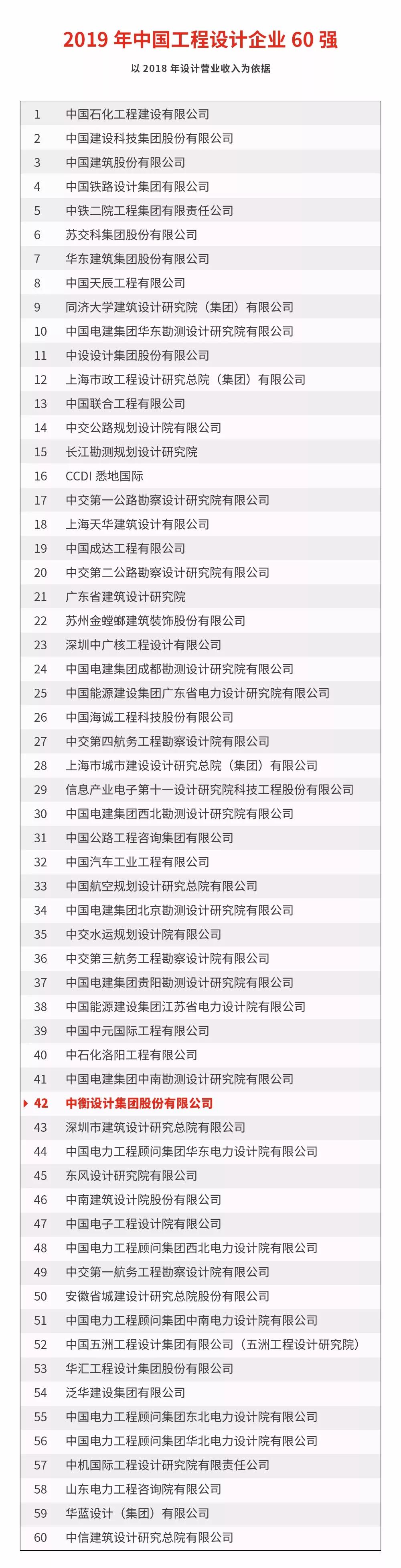 2019中國工程設計企業60強以包括石化、交通、電力、建筑等各大行業設計企業2018年設計營業收入為統計依據(不包含總承包的工程施工收入)。中衡設計此次躋身全行業第42位,排名較之2018年的51位有較大提升(2018年排名詳見文末“相關閱讀”),展現了集團積極應對國內外經濟和設計行業新形勢,充分利用公司集團化運作和區域布局的優勢,以市場需求為導向,以設計為核心,持續不斷地推進技術創新,強化公司核心競爭力,繼續保持健康、穩定的良好均衡發展態勢。