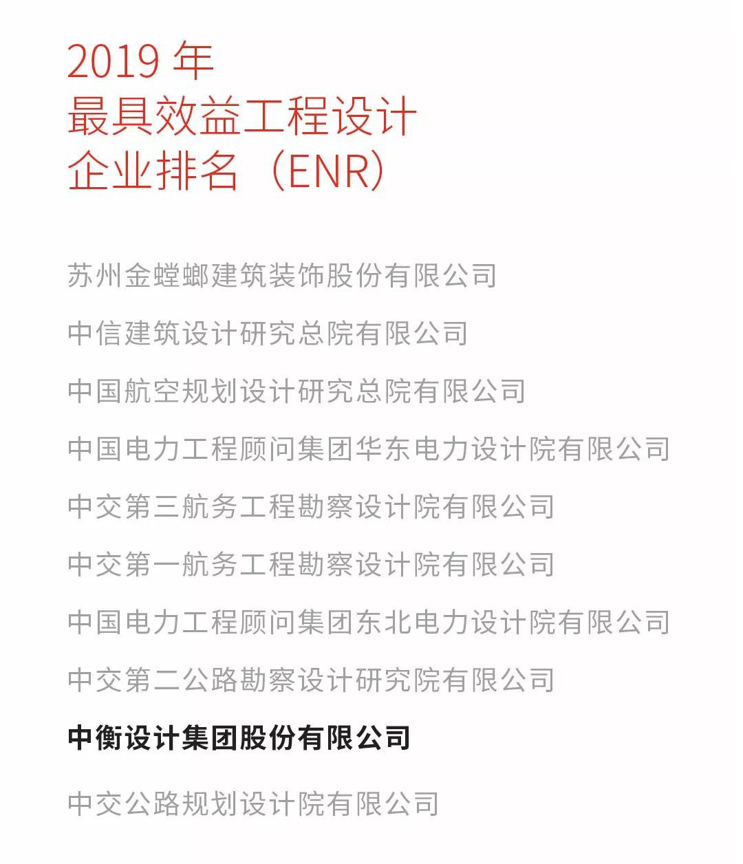 在8日舉辦的頒獎典禮上,還同時發布了2019ENR/建筑時報最具國際拓展力承包商、最具國際拓展力工程設計企業、最具效益承包商、最具效益工程設計企業、最值得推薦的10家中國工程法律專業律師事務所等榜單。中衡設計集團名列“2019年最具效益工程設計企業”榜單。