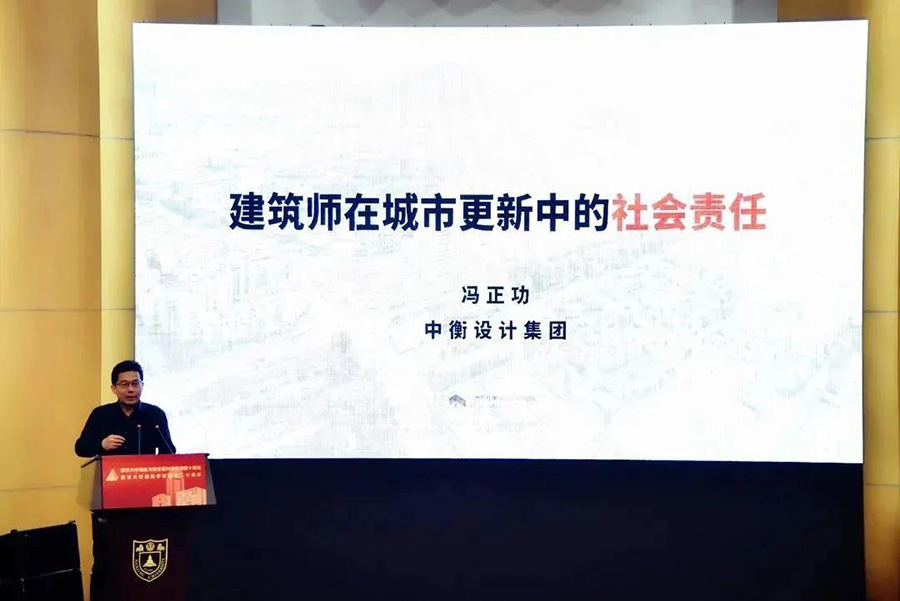 全國工程勘察設計大師、中衡設計集團董事長/首席總建筑師、南京大學兼職教授馮正功受邀參加了慶典,并在南京大學建筑學專業(yè)重建20周年慶典活動的重要內容——建筑大師學術報告會上作了《建筑師在城市更新中的社會責任》的學術報告。