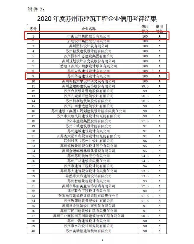 近日,蘇州市住房和城鄉建設局2020年度蘇州市工程勘察設計企業信用考評結果公布,中衡設計集團股份有限公司、中衡設計集團蘇州華造建筑設計有限公司雙雙信用得分100分,信用等級A級。據悉,本次共計38家工程勘察企業、234家建筑工程企業和24家市政工程企業接受綜合評定。經審定和公示,評出工程勘察A類企業10家、B類企業27家、C類企業1家;建筑工程A類企業40家、B類企業185家、C類企業9家;市政工程A類企業7家、B類企業17家。