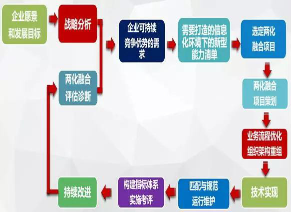 兩化融合是信息化和工業化的高層次的深度結合,是指以信息化帶動工業化、以工業化促進信息化;兩化融合的核心就是信息化支撐,追求可持續發展模式。兩化融合過程是企業獲取與企業戰略匹配的可持續競爭優勢的過程,是企業通過工業化與信息化的融合獲取能夠增加其可持續競爭力的新型能力的過程。