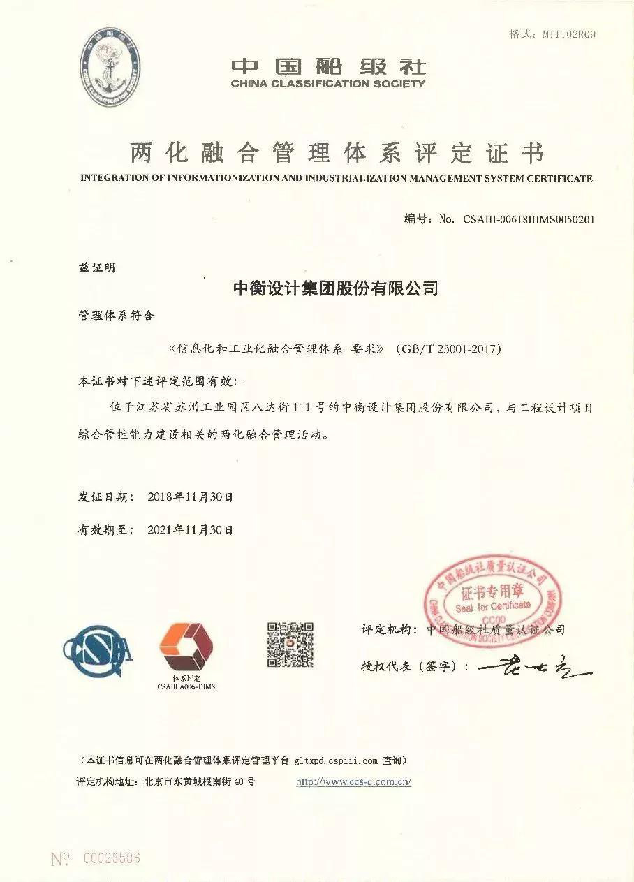2018年10月,來自中國船級社的專家對中衡設計集團進行了兩化融合體系貫標的現場評定,專家當場給予推薦結論,并一致認定:中衡設計集團兩化融合管理體系建設符合標準要求并符合公司戰略優勢獲取的需要。同時,通過新型能力的建設與運行,兩化融合管理體系已投入正常運轉,可以支撐未來打造更多與戰略相一致的新型能力,已產生實效。隨后,經過工業與信息化部的審核、公示,中衡設計最終于2018年11月正式取得兩化融合管理體系證書。