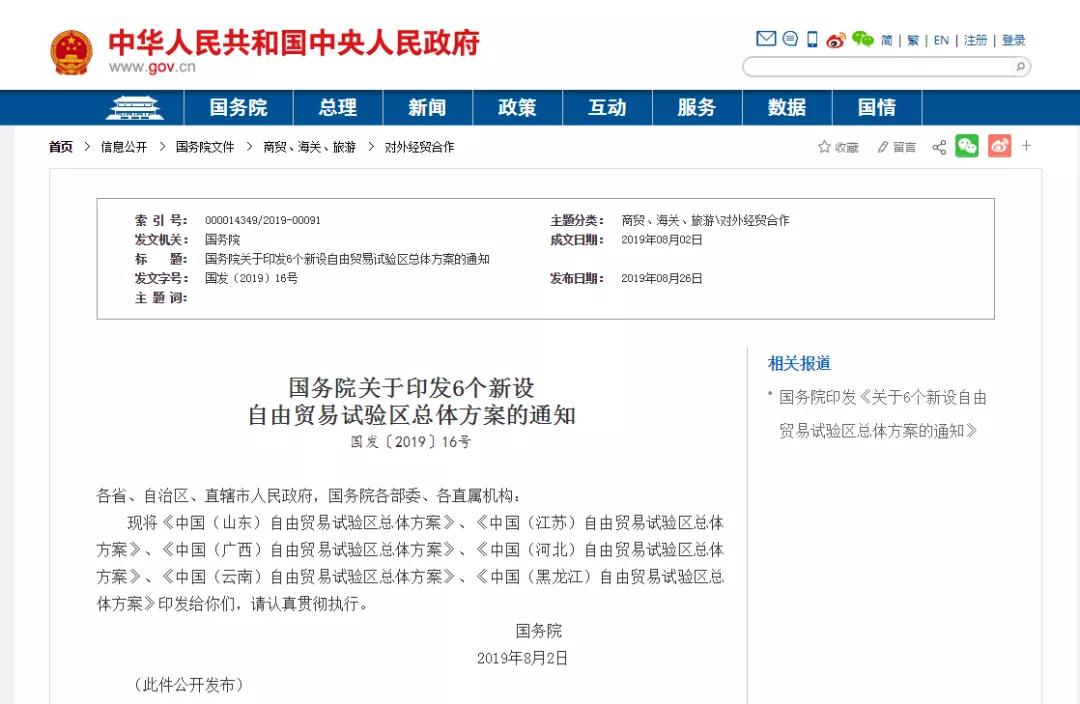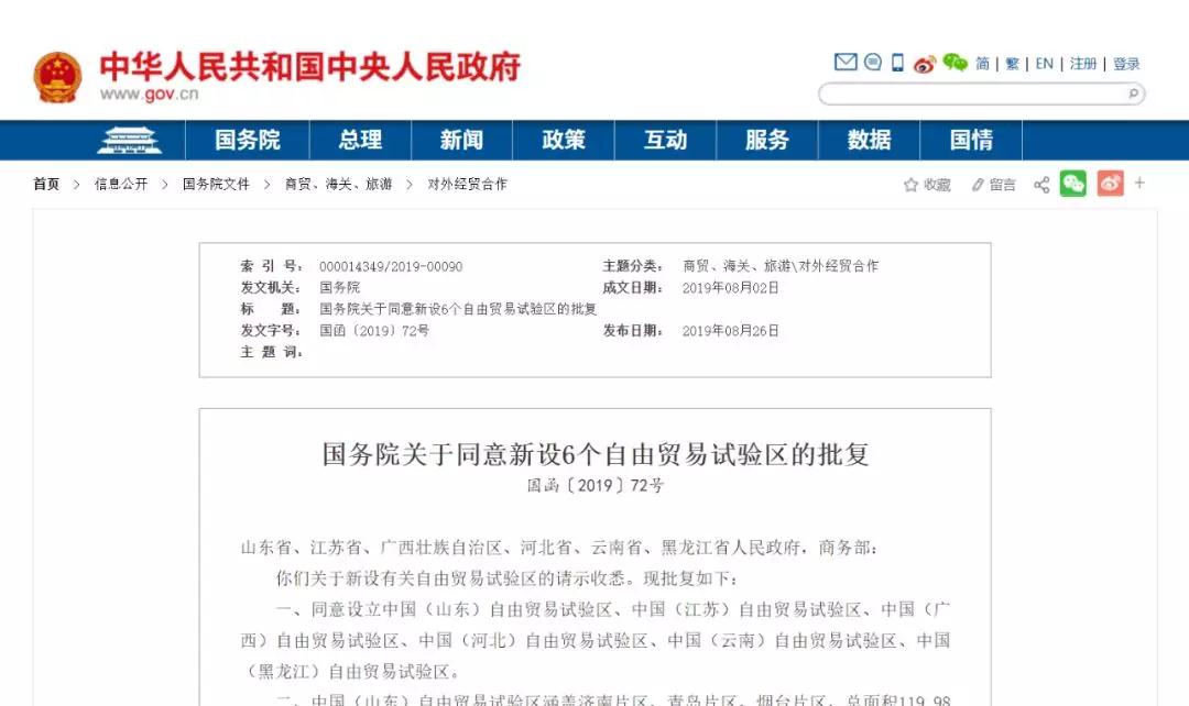 8月26日,中國政府網發文,國務院同意設立中國(山東)自由貿易試驗區、中國(江蘇)自由貿易試驗區、中國(廣西)自由貿易試驗區、中國(河北)自由貿易試驗區、中國(云南)自由貿易試驗區、中國(黑龍江)自由貿易試驗區等6個自由貿易試驗區,同時發布了《中國(山東)自由貿易試驗區總體方案》、《中國(江蘇)自由貿易試驗區總體方案》、《中國(廣西)自由貿易試驗區總體方案》、《中國(河北)自由貿易試驗區總體方案》、《中國(云南)自由貿易試驗區總體方案》、《中國(黑龍江)自由貿易試驗區總體方案》等6個新設自由貿易試驗區的方案。標志著江蘇自貿區建設啟幕。