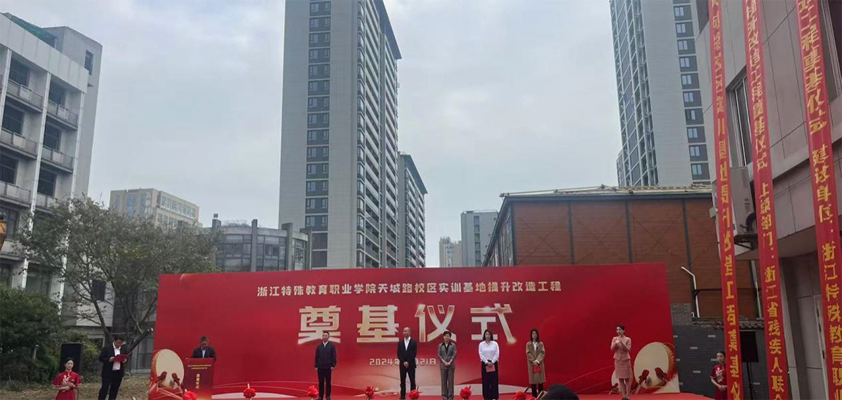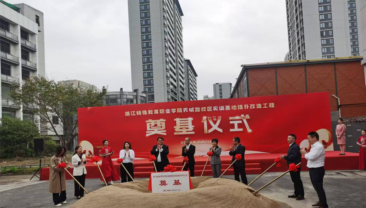 2024年10月21日,浙江特殊教育職業學院天城路校區實訓基地提升改造項目舉行奠基儀式。省殘聯黨組書記、理事長呂林;省殘聯黨組成員、副理事長陳益偉;省殘聯黨組成員,副理事長李一波;學校黨委書記王飛、院長黃宏偉以及項目參建各方代表共計一百余人參加了本次開工儀式。公司總經理高洪舟、執行總經理楊哲野及全咨項目部成員參加了本次開工儀式。